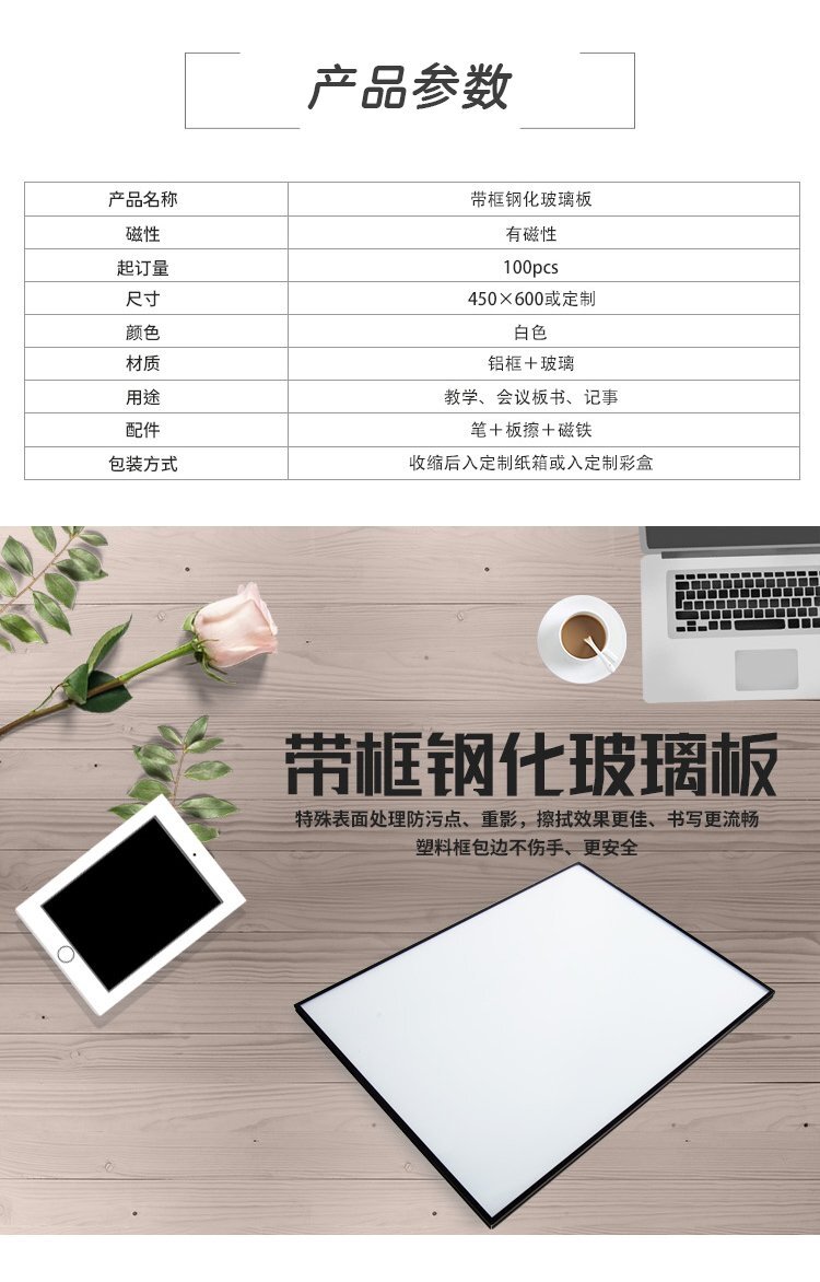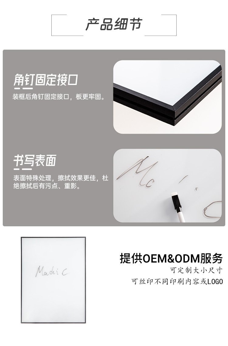 簡要描述:玻璃白板是一種高端辦公用品,具有鋁合金邊框和鋼化玻璃材質。其磁吸面板設計能夠方便用戶固定文件和便簽,使辦公更加整潔高效。這款45x60厘米的玻璃白板不僅尺寸適中,而且可以根據客戶需求進行定制,滿足不同 ...
